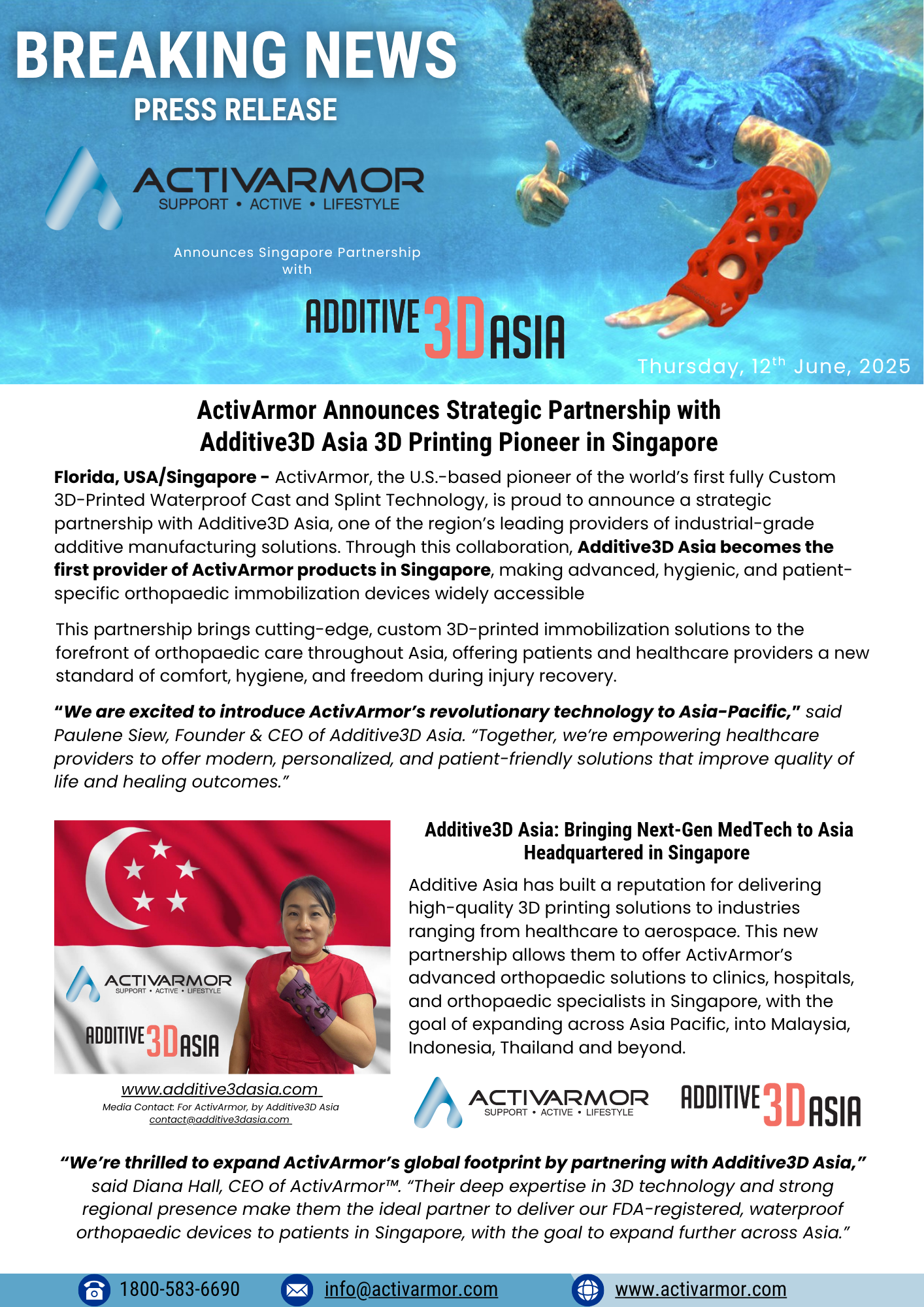 “We’re thrilled to expand ActivArmor’s global footprint by partnering with Additive3D Asia,” said Diana Hall, CEO of ActivArmor. “Their deep expertise in 3D technology and strong regional presence make them the ideal partner to deliver our FDA-registered, waterproof orthopaedic devices to patients in Singapore, with the goal to expand further across Asia.”