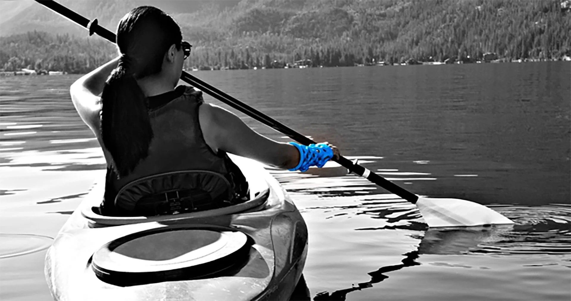 woman wearing a blue waterproof activarmor 3d printed cast while paddling a kayak on a lake